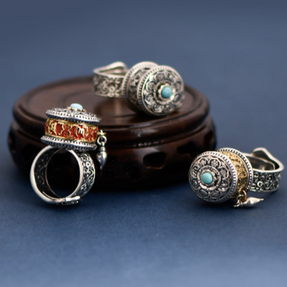 Tibetan Blessing Prayer Wheel Ring – Silver and Turquoise Spinner